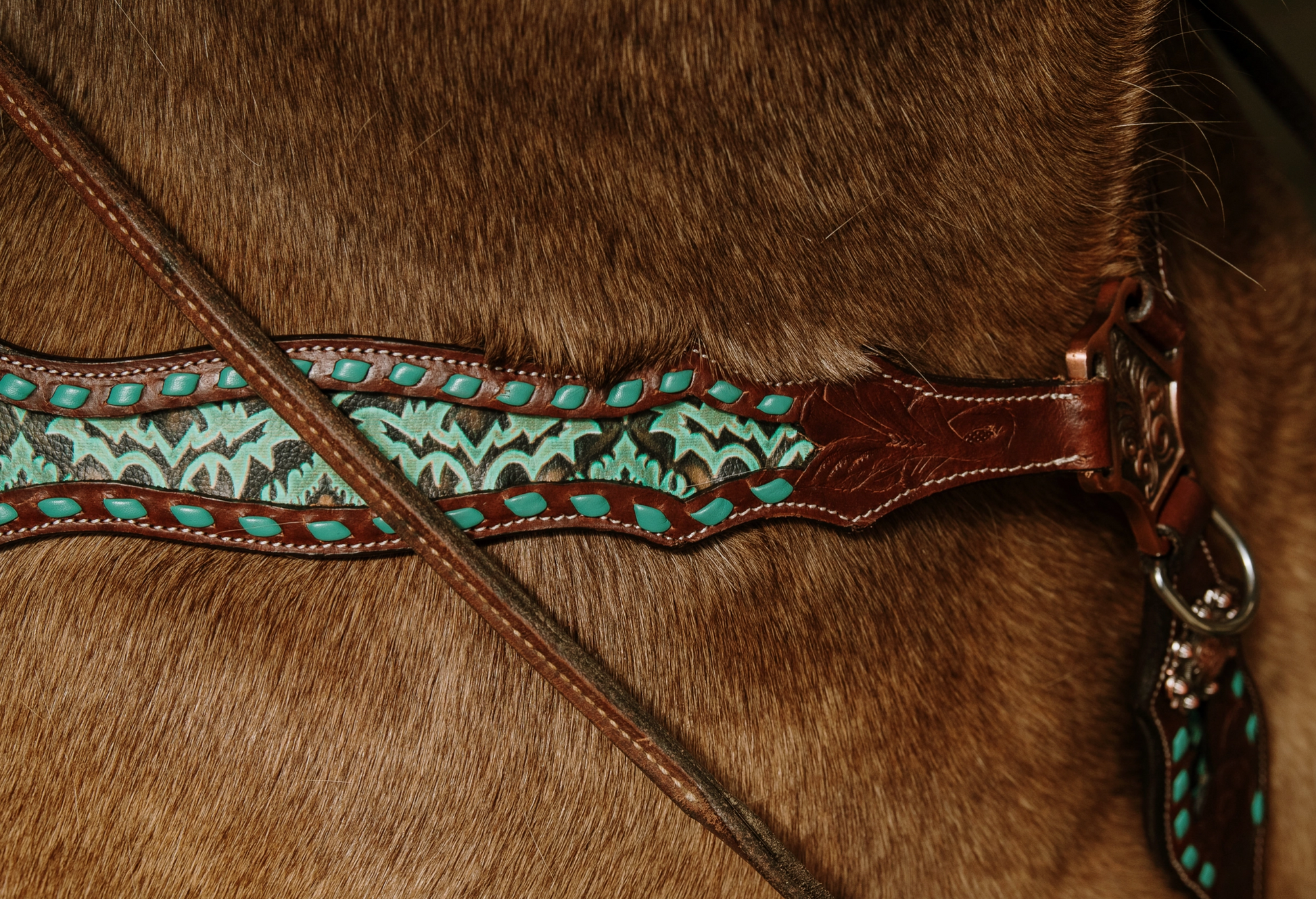 Turn heads in and out of the arena with this stunning dark oily leather headstall and breast collar set, crafted for both beauty and performance. Featuring a bold teal and brown Laredo print hide inlay, this set is accented with teal buckstitching, intricate floral tooling, and finished with antique copper conchos and silver buckles for a true Western statement.