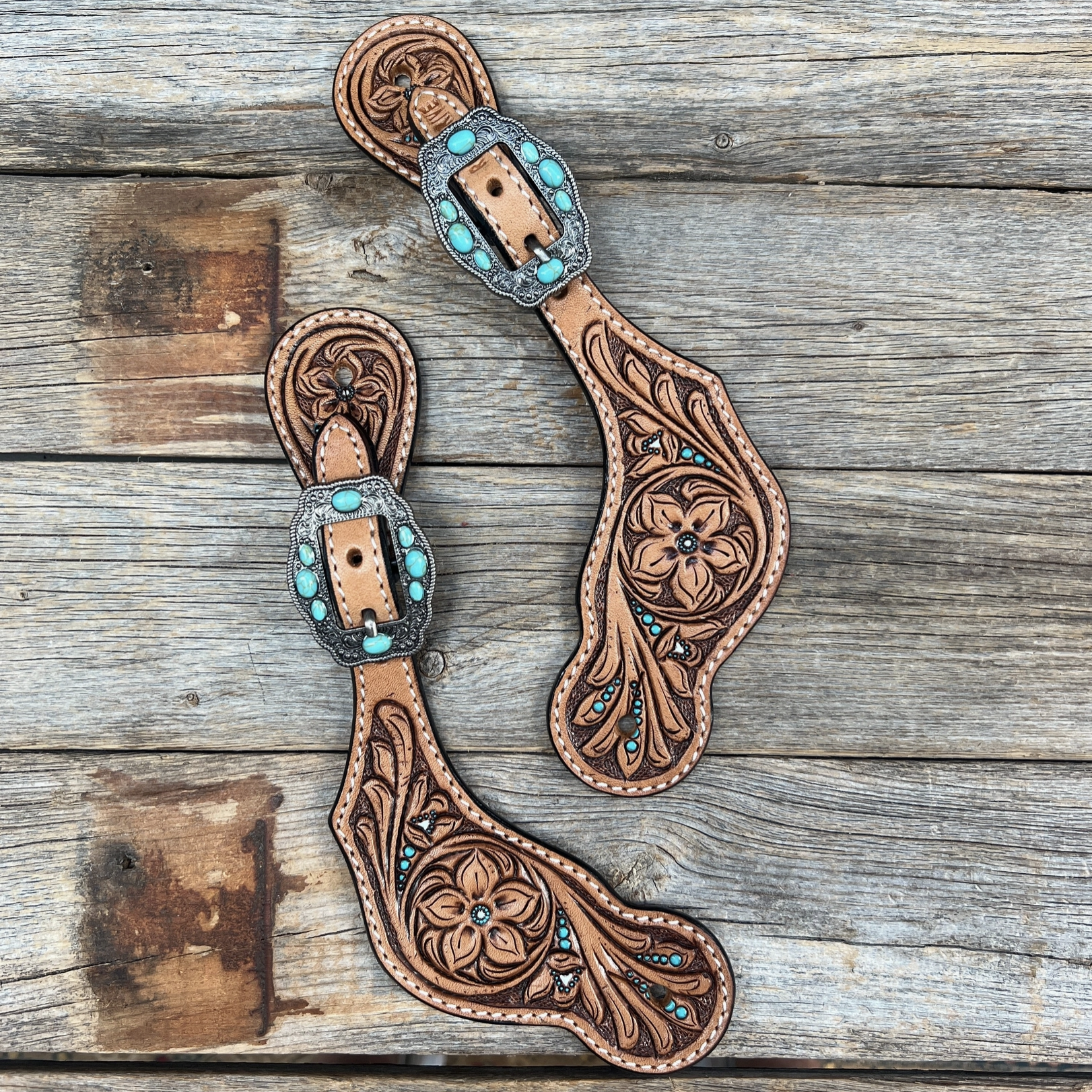 Add a touch of Western elegance to your ride with these stunning Floral Teal Dot Spur Straps. Crafted from light oil leather and accented with teal dots, these straps feature intricate floral tooling for a timeless Western look. The antique silver buckles are adorned with turquoise-colored stones, adding the perfect pop of color and shine.