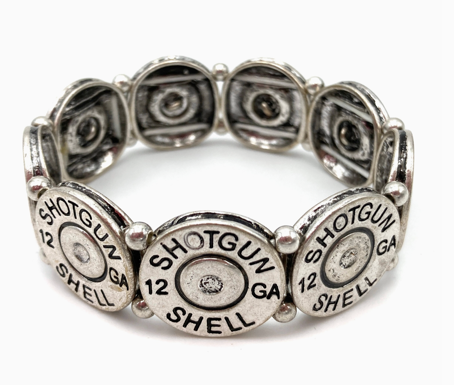 Show off your wild side with this bold, handcrafted stretch bracelet featuring vintage-inspired metal pieces engraved with "Shotgun 12 GA Shell". Each piece is carefully hand-stranded to create a rugged yet stylish accessory that shines with western charm and hunting spirit.